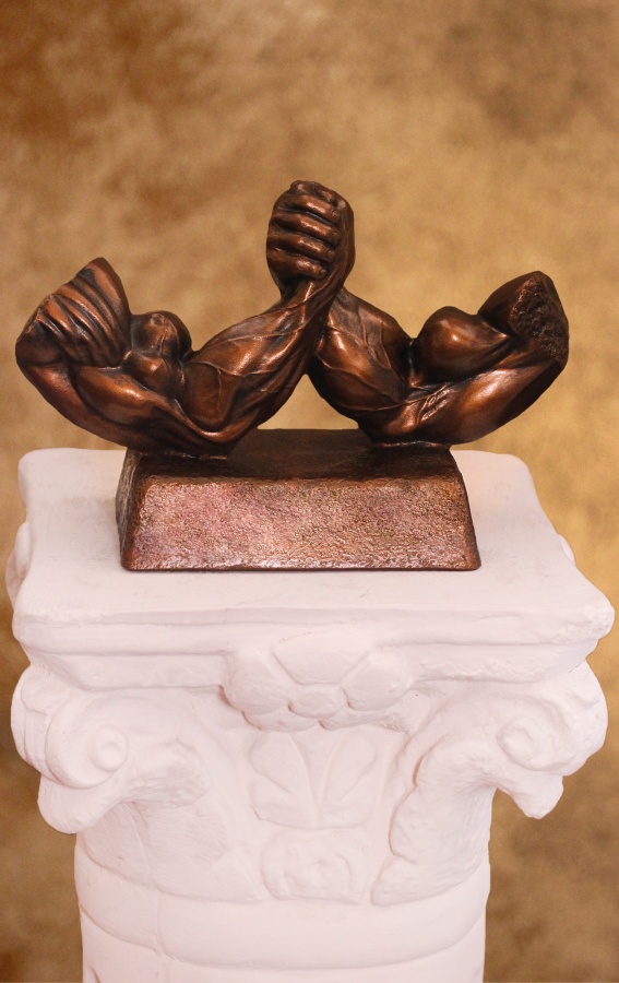 This Arm Wrestling trophy features a durable poly-resin statue of two muscular arms wrestling each other on a rock textured base.